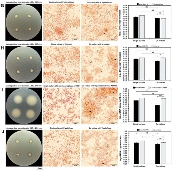 In contrast, growth was not significantly decreased in cocultures of the novel probiotic strain KU011TH and marine fish pathogens, including V. alginolyticus, V. harveyi, V. parahaemolyticus AHPND and V. vulnificus, compared with the corresponding single cultures (p > 0.05) (Table 8). Additionally, significantly decreased growth of the bacterial strain KU011TH in coculture with Vibrio spp. compared to the growth in single culture was not observed (p > 0.05), whereas significantly decreased growth of the bacterial strain KU011TH in coculture with V. parahaemolyticus AHPND was observed (p < 0.01). No changes in the cell morphology of the strain in coculture with Vibrio spp. were observed. Full-scale interactions indicating the antagonistic activity of the bacterial strain KU011TH against various fish pathogens are shown in Table 8 and Figure 6.