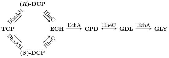 Model of metabolic pathway for biodegradation of TCP. A general scheme of an enzymatic metabolic pathway for biodegradation of TCP into GLY. Note that DhaA31 produces two different enantiomers of 2,3-dichloropropane-1-ol (DCP) with similar rate. However, enzyme HheC has notably different enantioselectivity with them. It is also worth noting that enzymes HheC and EchA are employed twice in the pathway. Other intermediates are epichlorohydrin (ECH), 3-chloropropane-1,2-diol (CPD), and glycidol (GDL).