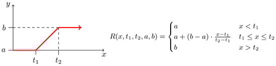 Definition of the ramp function. (Right) A mathematical definition of an increasing ramp function as used in our workflow. Parameters a and b are usually set to values 0 and 1, respectively; and vice versa for decreasing version. Values and typically represent some significant thresholds on x. (Left) Graphical description of the same function.