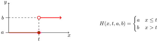 Definition of the Heaviside step function. (Right) A mathematical definition of an increasing Heaviside step function as used in our workflow. Parameters a and b are usually set to values 0 and 1, respectively; and vice versa for decreasing version. Value t typically represents an important threshold in the domain of x. (Left) Graphical description of the function—specifically, the increasing version.