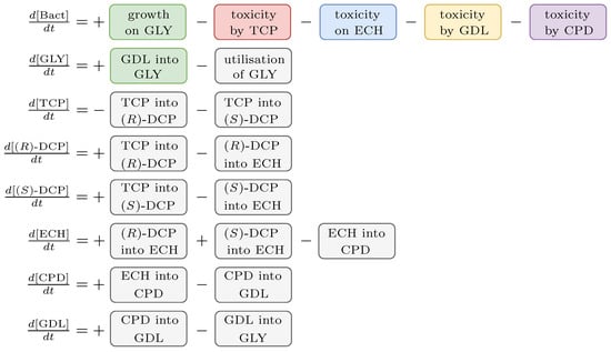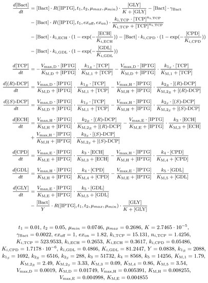 Dvorak and co-workers [18] tested three different forms of the enzyme DhaA (two of them mutant) in order to improve the efficiency of the pathway. Nevertheless, we consider only the most effective form denoted DhaA31 (referred to here as DhaA for simplicity). This particular enzyme produces two different enantiomers of the DCP compound with a similar rate ( as the 55% of 1.05 () for (R)-DCP and as the 45% of 1.05 () in favor of (S)-DCP). However, the enzyme HheC is enantioselective and prefers (R)-DCP ( vs. , where the greater means the better). As a consequence, (S)-DCP accumulates during the biodegradation process until (R)-DCP is consumed. Note that both enantiomers are supposed to be equally toxic to the host.