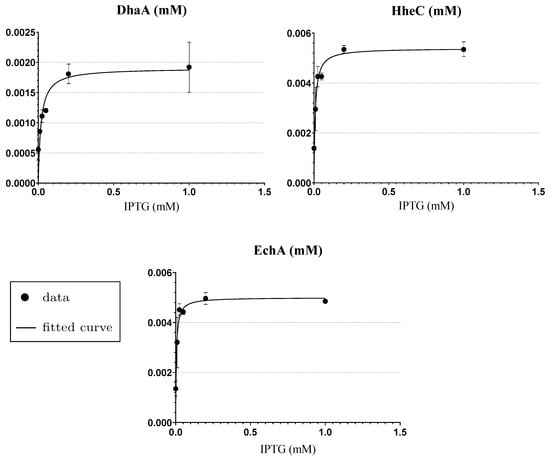 Based on the simplifying assumptions mentioned above, the concentration levels of DhaA, HheC and EchA are represented as constants in the input mathematical model (Figure S2). In such settings, these constants can be understood as parameters. To extend the model with respect to IPTG concentration and in agreement with Step 1 in Section 2.5.2, it is necessary to define functions describing the concentrations of enzymes depending on the concentration of IPTG. We extracted these functions by parameter fitting to experimental data obtained from densitometric analysis of enzyme cell-free extracts prepared from cells induced with different IPTG concentrations (more details in Appendix A). To that end, we employed Michaelis–Menten kinetics because the data showed a good agreement with its shape (Figure 5), although the MM is typically used for the description of a rate and not a concentration. The quantitative result of the fitting with statistical evaluation is shown in Table S1.