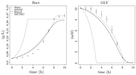 Results of fitting to population growth data. Two plots showing different results of fitting to population growth data from two points of view: (left) the particular results for CDW starting at 0.0429 and ending at 0.468 g/L after 10 h of growth; and (right) the result for the substrate utilisation only starting at 10.12 and ending at 0.07 mM after 10 h of growth. The experimental data are pictured as points with standard error bars, the dashed lines show simulation data for initial values of Monod function (i.e., initial point of fitting), the solid lines show the results of fitting (Section 2.4.1) and the dotted lines represent the final results optimised by MCMC method of the FME package (Section 2.4.1), which show the best agreement with the experimental data. The x-axes show time of experiment in hours; the y-axis of the right plot shows the concentration of GLY in mM; and the y-axis of the left plot shows CDW in g/L of bacterial population (Bact).