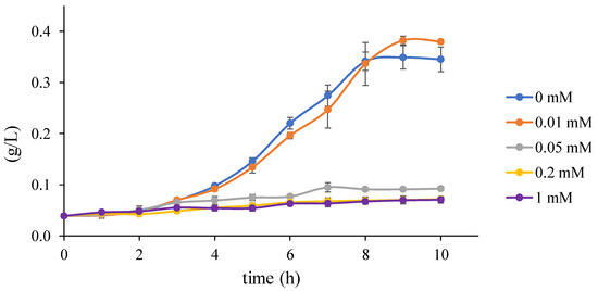Cells of E. coli BL21(DE3) strain carrying empty plasmids and degrading strain deg31 were pre-grown in LB medium containing respective antibiotic combination (75 g/mL ampicillin and 25 g/mL streptomycin) at 37 °C until the culture reached stationary phase. The cells were then centrifuged at 6000× g and resuspended in Synthetic Mineral Medium (SMM) [18]. SMM medium (15 mL) with 10 mM glycerol in 25-mL Reacti Flask closed with screw cap was preincubated at 37 °C, growth test was initiated by addition of cells to 0.1 . Growth medium was supplemented with IPTG to the final concentrations 0, 0.01, 0.05, 0.2 and 1 mM. Cells were incubated at 37 °C with shaking (200 rpm). Optical density () of the culture was measured periodically and cell dry weight (CDW) in g/L at given time intervals was determined by multiplying the values by 0.39 g/L [24]. Acute toxicity measurement was performed in the same conditions, and the medium for toxicity test contained respective concentrations of TCP pathway metabolites.