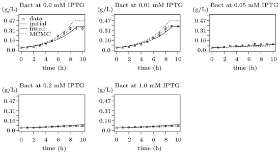 For the fitting procedure, we use several tools. GraphPad Prism (https://www.graphpad.com/) (version 8.2.1 (441)) is used in Section 3.3 to fit the functions describing the stable concentration level of enzymes induced by IPTG. The tool GUI is easy to use for traditional functions such as Michaelis–Menten. However, to investigate and compare the usability of a comprehensive set of functions, we use a more advanced tool—the FME package (https://cran.r-project.org/web/packages/FME/index.html) (version 1.3.5) [54] of the R language [55]. It offers well-documented procedures: parameter identifiability; parameter sensitivity; parameter fitting; and more.