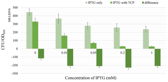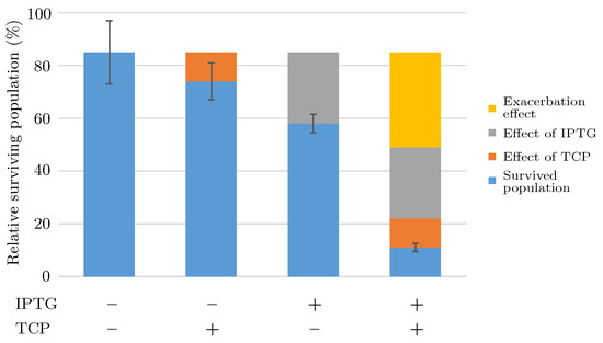Escherichia coli strain BL21(DE3) is frequently used in synthetic biology with embedded protein expression (pET) vectors enabling heterologous protein expression [1,2,3,4,5,6]. Especially, it has recently found use as a cell factory for heterologous expression of entire biochemical pathways [7,8,9,10,11]. In spite of its common usage in metabolic engineering, the expression system in E. coli BL21(DE3) suffers from certain problems primarily caused by strong overexpression of recombinant proteins triggered by exposing the cognate -T7 expression system to the synthetic inducer isopropyl-beta-D-thiogalactopyranoside (IPTG) [12]. Such negative effects that result from prioritising high levels of protein production to normal metabolic capacities in host cells are known as the metabolic burden [13,14]. One of the known factors causing the burden is the energetically expensive maintenance and replication of plasmid vectors carrying heterologous genes [15,16,17]. Other factors are associated with the activities of the foreign proteins which may interact with the metabolic network of the cell and burdens linked to the components of the expression system itself, such as IPTG. The individual factors may not always be additive, but can sometimes potentiate each other, leading to significantly larger effects on the living cells—the so-called exacerbation effect.