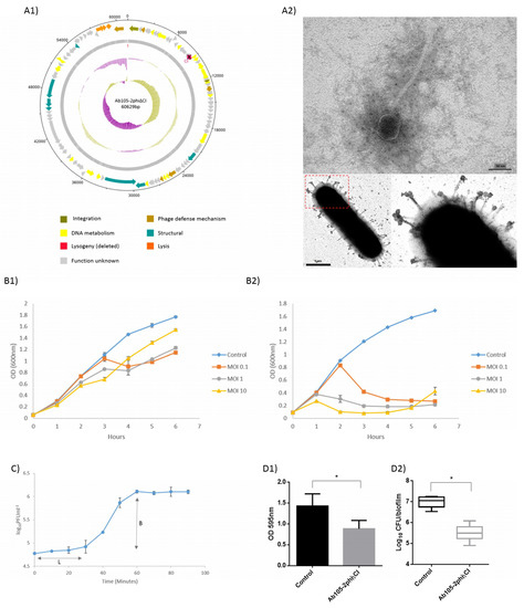 - Merabishvili, M.; Vandenheuvel, D.; Kropinski, A.M.; Mast, J.; De Vos, D.; Verbeken, G.; Noben, J.P.; Lavigne, R.; Vaneechoutte, M.; Pirnay, J.P. Characterization of newly isolated lytic bacteriophages active against Acinetobacter Baumannii. PLoS ONE 2014, 9, e104853. [Google Scholar] [CrossRef] [PubMed]