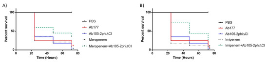 3.7. Galleria mellonella Survival Assays in the Presence of Meropenem and Imipenem in Combination with the Lytic Mutant Phage Ab105-phi2ΔCI