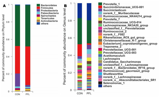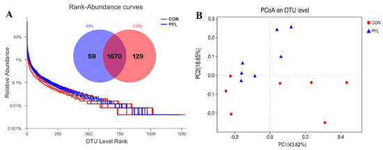 The number of sequences (total and average) before filtering is 797,635 and 56,974, respectively. The number of sequences (total and average) after filtering is 455,756 and 32,554, respectively. There were 1858 OTUs that were identified in PFL and CON cows, among which 1670 OTUs were found in both groups and accounted for 90.0% of the total OTUs, indicating the presence of an extensive common microbiome (Figure 1A). Compared with the CON, the PFL group had more OTUs (p < 0.01; Figure 1A). The PCoA based on Bray–Curtis dissimilarity was applied to analyze the difference in bacterial composition between PFL and CON groups. The PCoA plots (Figure 1B) showed that the clouds derived from the PFL and CON data had a tendency to be separated from each other. A similar level of species richness existed between PFL and CON based on the Sobs, Shannon, Simpson, Ace, Chao, and coverage index analyses, which indicated that there was a similar tendency of diversity and uniformity between PFL and CON (Table 3).