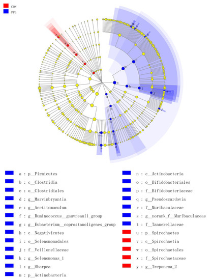 The ruminal bacteria (highlighted by small circles and by shading) showing different abundance values between Perilla frutescens leaf (PFL) and control (CON) groups. There are six layers from the inside of this plot to the outside, corresponding to six levels of taxonomy (kingdom, phylum, class, order, family, and genus). Each node (small circle) represents a taxon. Blue and red nodes represent the bacterial community of PFL with the significant higher and lower abundance in PFL compared with that in the CON group, respectively. Yellow nodes indicate the bacteria that are not statistically and biologically differentially between the two groups. The diameter of each circle is proportional to the taxon’s abundance.