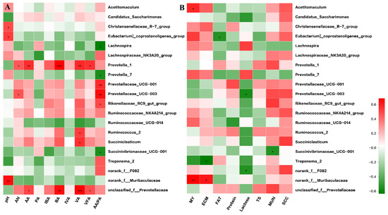Correlation matrix between the top 20 ruminal bacterial genera and rumen fermentation parameters (A) and between the top 20 ruminal bacterial genera and milk performance variables (B). Positive correlations are shown in red and negative correlations are shown in green. The color intensity is proportional to the correlation values [r] within a correlation group. * p < 0.05; ** p < 0.01. AN = ammonia nitrogen, AA = acetate, PA = propionate, IBA = isobutyrate, BA = butyrate, VA = valerate, IVA = isovalerate, VFA = total volatile fatty acids, AA_PA = the ratio of acetate to propionate, MY = milk yield, ECM = energy corrected milk, TS = total solids, MUN = milk urea nitrogen, SCC = somatic cell count.