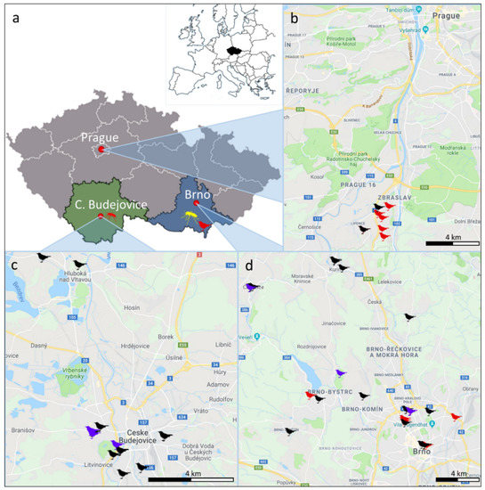 Localization of the cadavers of blackbirds (Turdus merula) and song thrushes (T. philomelos) collected in 2017–2019 in the three geographical locations in the Czech Republic (indicated in black in the overview map of Europe) and used for detection of Usutu virus (USUV). (a) Localization of the three main sampling sites (cities of Prague, Brno and Ceske Budejovice) and localization of the three additional USUV positive samples collected outside the area of the three cities are depicted in the map of the Czech Republic. The region of South Moravia is labeled by a blue background and the region of South Bohemia by green. Bird pictogram indicates an USUV positive blackbird, collected in the town of Breclav-South Moravia); mosquito pictograms indicate USUV positive mosquito pools (pool of Cx. modestus collected near Hlohovec-South Moravia in yellow, Culex pipiens collected near Lomnice nad Luznici-South Bohemia in red). Position of cadavers of blackbirds and song thrushes collected in the three cities are presented in the remaining maps: Prague (b), Ceske Budejovice (c), Brno (d). Blackbirds negative for USUV genomic RNA are indicated in black, USUV positive blackbirds in red, and song thrushes (all USUV negative) in violet.