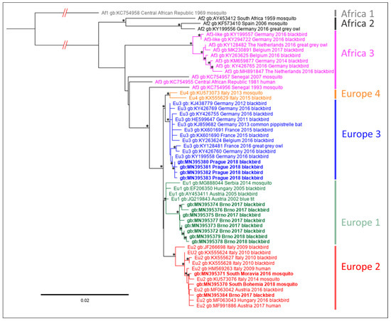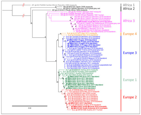 Phylogenetic maximum likelihood tree based on partial NS4B-coding nucleotide sequence and complete-coding sequences of NS5 protein of Usutu virus (nucleotide positions 7372–10,398 according to complete genome sequence of Vienna strain, AY453411). Sequence Africa 1, AY453412 was used as the outgroup. The code of the sequences consists of GenBank accession number, place and year of origin. The sequences obtained in this study are indicated by bold; individual geographical lineages are color-coded). The tree was generated using the GTR+I+G substitution model and 1000 replicates bootstrap analysis. Nodes with bootstrap support of <50% are indicated by asterisk. The lengths of tree branches correspond to the number of substitutions per site.