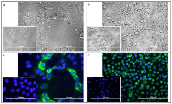Mammalian, porcine kidney (PS) (a,c) and mosquito C6/36 cells (b,d) infected by the strains of Usutu virus isolated from dead blackbirds in this study. Infected cell cultures are presented in the large images and uninfected control cells in smaller images (3 days post-infection). Cytopathic effect was observed in infected PS cells (a) whereas no such changes were seen in C6/36 mosquito cells (b). Flaviviral E protein antigen was labeled using indirect immuno-fluorescence (green) in PS (c) and C6/36 cells (d). Cell nuclei were counterstained using DAPI (blue).