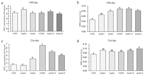 - Vicu, A.E.A.; Kuttappan, V.A.; Tellez, G.; Hernandez-Velasco, X.; Seeber-Galarza, R.; Latorre, J.D.; Faulkner, O.B.; Wolfenden, A.D.; Hargis, B.M.; Bielke, L.R. Dose titration of FITC-D for optimal measurement of enteric inflammation in broiler chicks. Poult. Sci. 2015, 94, 1353–1359. [Google Scholar]
