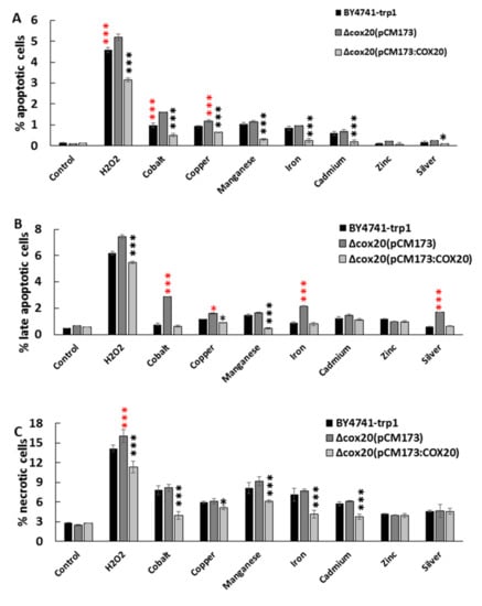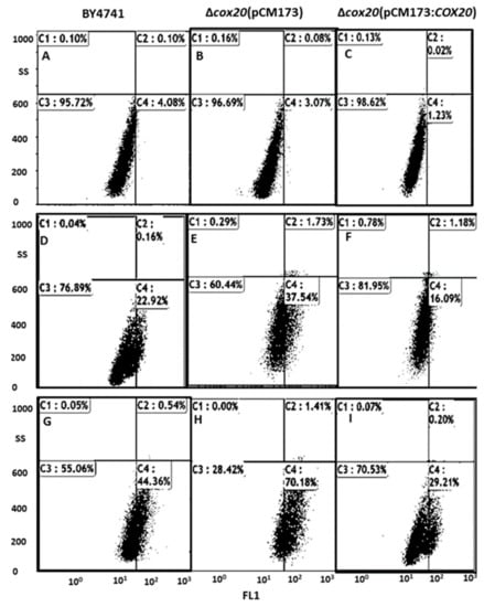 3.3. Overexpression of COX20 Reduced the Presence of Apoptotic, Late Apoptotic, and Necrotic Yeast Cells