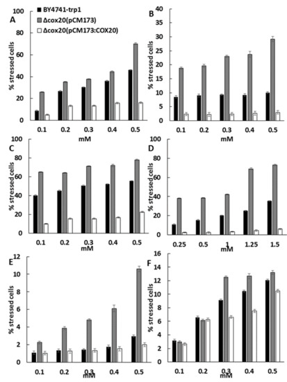 - Kumar, V.; Hart, A.J.; Keerthiraju, E.R.; Waldron, P.R.; Tucker, G.A.; Greetham, D. Expression of Mitochondrial Cytochrome C Oxidase Chaperone Gene (COX20) Improves Tolerance to Weak Acid and Oxidative Stress during Yeast Fermentation. PLoS ONE 2015, 10, e0139129. [Google Scholar] [CrossRef]