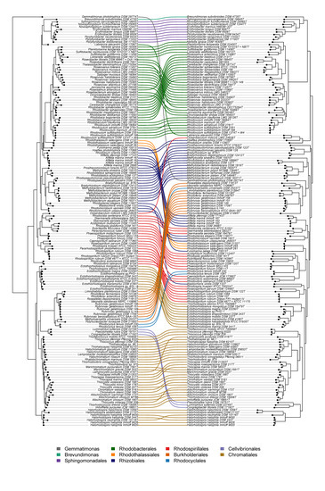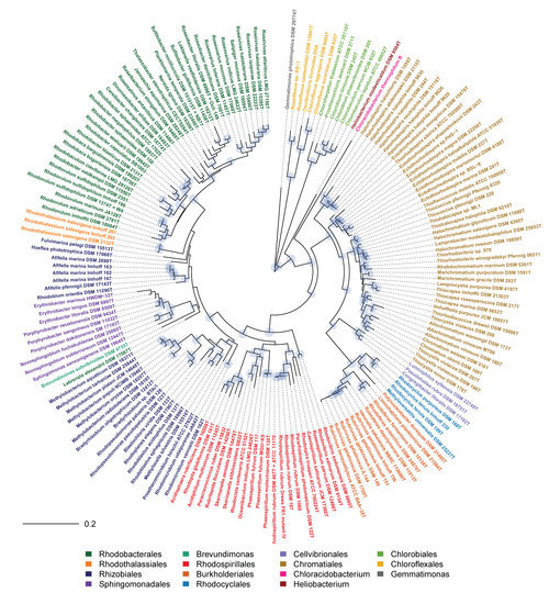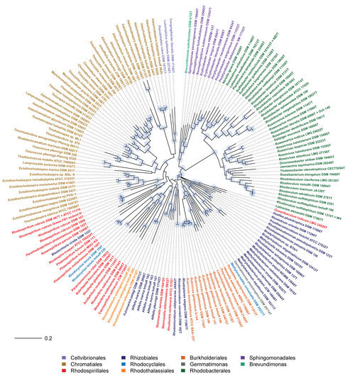 35. Imhoff, J.F. Genus Rhodovulum. In Bergey’s Manual of Systematic Bacteriology, 2nd ed.; Brenner, D.J., Krieg, N.R., Staley, J.T., Eds.; Springer: New York, NY, USA, 2005; Volume 2, pp. 205–209. [Google Scholar]