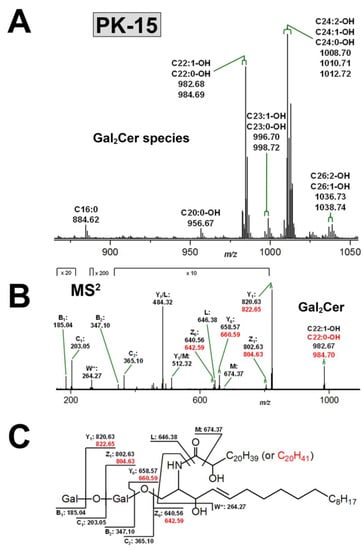 Figure 4A depicts the mass spectrum of the proposed Gb3Cer and Gb4Cer species obtained from PK-15 cells detected in the relevant m/z range. Again, all GSL species appear as [M+Na]+ ions and their identified structures are listed in Supplementary Table S2. The observed heterogeneity of the GSL species is due to ceramides with constant d18:1 sphingosine but varying fatty acid chain length, as described in the preceding chapter for the Gb3Cer and Gb4Cer lipoforms of LLC-PK1 cells. Owing to the apparent signal intensities, ceramides with (d18:1, C16:0), (d18:1, C22:0), and (d18:1, C24:1/C24:0) structure are the prevalent lipid anchors of the various Gb3Cer and Gb4Cer species. Gb4Cer-derived ions strictly preside over less abundant Gb3Cer species in the MS1 spectrum and may represent the major Stx receptor GSLs of PK-15 cells. An exemplary MS2 spectrum demonstrating the high resolution capacity of the employed MS strategy is given in Figure 4B, unravelling the structures of the individual variants of the Gb4Cer triplet consisting of hydroxylated di- and mono-unsaturated and saturated variants with Cer (d18:1, C24:2-OH), Cer (d18:1, C24:1-OH), and Cer (d18:1, C24:0-OH) lipoforms, respectively. The CID spectrum is explained in the accompanying fragmentation scheme in Figure 4C.