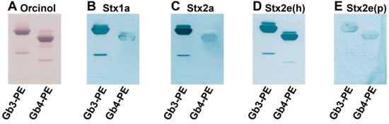 Targeting the synthesis of defined and homogenous glycolipids with Gb3- or Gb4-headgroups as a diagnostic tool for differentiation of the binding specificities of the various Stx subtypes or for employment as neutralizers of Stx cytotoxicity, a semisynthetic approach was chosen for the production of Gb3- and Gb4-neoglycolipids harboring a stable and consistent lipid anchor. The orcinol stain of Gb3-PE and Gb4-PE, produced from commercially available Gb3 and Gb4 oligosaccharides by coupling them to twin-tailed phosphatidylethanolamine (PE), is shown in Figure 6A. The minor sharp lower migrating bands are derived from neoglycolipids containing two oligosaccharide moieties, i.e., (Gb3)2-PE and (Gb4)2-PE, respectively. Corresponding compounds are commonly obtained as byproducts of the coupling reaction in the lower single-digit percentage range. Stx1a and Stx2a bound preferably to Gb3-PE and with less affinity towards Gb4-PE, as can be deduced from the TLC overlay assays depicted in Figure 6B,C, respectively. A shift of preference towards interaction with Gb4-PE was observed for Stx2e(h) and Stx2e(p), as shown in Figure 6D,E, respectively. Interestingly, the Stx2e(p) variant exhibited vastly less recognition intensity as compared with the human Stx2e(h) counterpart.