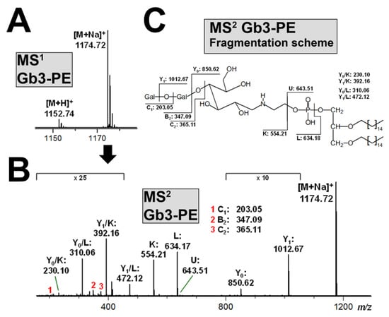 MS1 spectrum (A) and MS2 structural proof (B) with corresponding fragmentation scheme (C) of the produced neoglycolipid Gb3-PE. MS analysis using the positive ion mode exhibits dominance of monosodiated [M+Na]+ ions over the protonated [M+H]+ ion species (A). The [M+Na]+ ions at m/z 1174.72 were selected for MS2 analysis (B) and the obtained breakdown products are explained by the auxiliary fragmentation scheme (C).