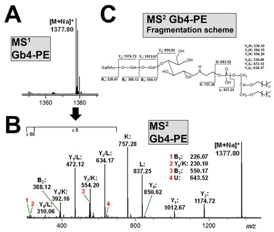 MS1 spectrum (A) and MS2 structural proof (B) with corresponding fragmentation scheme (C) of produced Gb4-PE. The MS analysis using the positive ion mode exhibits solely monosodiated species ([M+Na]+) (A). The [M+Na]+ ions at m/z 1377.80 served as precursor ions for the MS2 analysis (B) explained by the supporting fragmentation scheme (C).