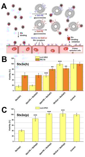 Scheme of attachment of Stx2e to the cellular receptors Gb3Cer and Gb4Cer, its interaction with Gb3-PE and Gb4-PE in the cell culture (A) and protective effect of the neoglycolipids towards porcine LLC-PK1 and PK-15 kidney epithelial cells exerted by Stx2e(h) (B) and Stx2e(p) (C). (A) Gb3-PE- and Gb4-PE-spiked glycovesicles were applied to block the binding of Stx2e towards Gb3Cer and Gb4Cer. (B) Stx2e(h) derived from a human STEC isolate and (C) Stx2e(p) from a porcine STEC isolate were solely applied or together with the neoglycolipids Gb3-PE and Gb4-PE or with authentic Gb3Cer (gold standard) as indicated. Cell survival was determined in relation to control cells cultured in medium without toxin corresponding to 100% viability. Significant differences of viability of cell cultures treated with Stx2e only (controls) or co-treated with Gb3-PE-, Gb4-PE- or Gb3Cer-spiked glycovesicles are indicated with asterisks (** p < 0.01; *** p < 0.001).