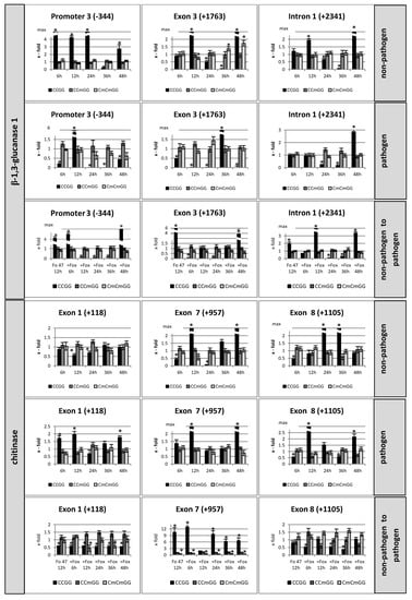 Changes in DNA methylation pattern of β-glucanase 1 and chitinase in flax seedlings treated with non-pathogenic or pathogenic strains of Fusarium oxysporum and after sensitizing effects of the non-pathogenic strain treated with pathogenic Foln3 at 6, 12, 24, 36, and 48 h after inoculation presented as x-fold change in relation to control. The analysis of the third position in the exon, the first in the intron, and the third in the promoter of β-1,3-glucanase 1 and the first, seventh, and eighth positions in the exon of chitinase was performed by the digestion of genomic DNA by the restriction enzymes HpaII and MspI and then the real-time PCR reaction. The data represent the mean from three biological repetitions. Asterisks mark statistically significant differences (p < 0.05) between the treated samples and their own controls.