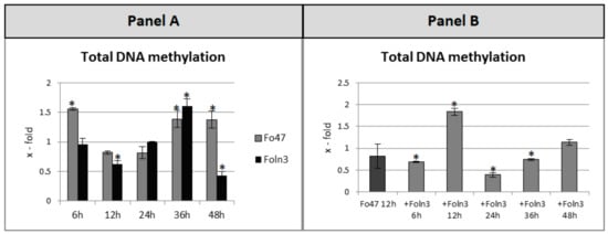Total DNA methylation in flax seedlings treated with non-pathogenic (Fo47) or pathogenic strains of Fusarium oxysporum (Foln3) (panel A) and after sensitizing effects of the non-pathogenic strain treated with pathogenic Foln3 (+ Foln3) (panel B) at 6, 12, 24, 36, and 48 h after inoculation. The data represent the mean from three biological repetitions. Asterisks mark statistically significant differences (p < 0.05) between the treated samples and their own controls.