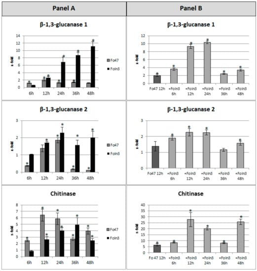 Expression level of β-glucanase 1, β-glucanase 2, and chitinase in flax seedlings treated with non-pathogenic (Fo47) or pathogenic strains of Fusarium oxysporum (Foln3) (panel A) and after sensitizing effects of the non-pathogenic strain treated with pathogenic Foln3 (+ Foln3) (panel B) at 6, 12, 24, 36, and 48 h after inoculation. The data were obtained from real-time RT-PCR analysis. Actin was used as a reference gene and the transcript levels were normalized to the control plant. The data represent the mean ± standard deviations from three biological repetitions. Asterisks mark statistically significant differences (p < 0.05) between the treated samples and their own controls.