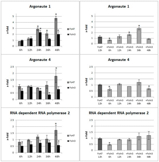 Expression levels of genes involved in DNA methylation (chromomethylase 1, chromomethylase 3, demeter, repressor of silencing 1, argonaute 1, argonaute 4, RNA-dependent RNA polymerase 2) in flax seedlings treated with non-pathogenic (Fo47) or pathogenic strains of Fusarium oxysporum (Foln3) (panel A) and after sensitizing effects of the non-pathogenic strain treated with pathogenic Foln3 (+ Foln3) (panel B) at 6, 12, 24, 36, and 48 h after inoculation. The data were obtained from real-time RT-PCR analysis. Actin was used as a reference gene and the transcript levels were normalized to the control plant. The data represent the mean ± standard deviations from three biological repetitions. Asterisks mark statistically significant differences (p < 0.05) between the treated samples and their own controls.
