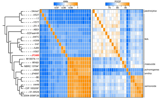 Cladogram showing the phylogenetic relations between JF2480 and other A. salmonicida strains. Only bootstrap values inferior to 100 are shown at the corresponding nodes. The heatmap represents the ANI values (in the middle) and the POCP values (on the right).