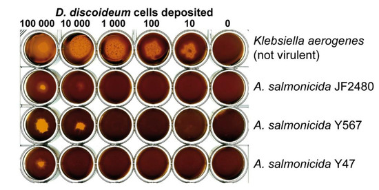 In the past, it has been shown that bacteria without a functional T3SS and especially Aeromonas bacteria were not virulent when tested in the predation assay involving the soil amoeba D. discoideum used as a surrogate host [36,46]. A low quantity of amoebae was able to create a phagocytic plaque on K. aerogenes (the positive control) while only a high quantity of D. discoideum cells was required to observe amoebal growth on JF2480 (Figure 3). Thus, bacterial virulence assays conducted on JF2480 revealed that this strain is virulent when facing D. discoideum even in absence of a complete T3SS compared to K. aerogenes bacterium known to be totally avirulent [47]. Other mesophilic A. salmonicida strains do not possess a complete T3SS. It is the case, among others, of the strains Y567 and Y47 isolated in a food market in India [10] (Table 1). These two strains have also displayed a clear virulence against D. discoideum (Figure 3).