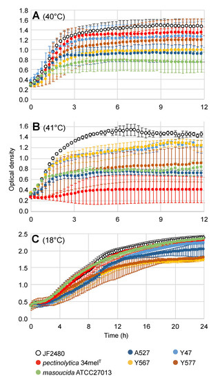 Bacteria from overnight growth on TSA at 37 °C (for all bacteria except masoucida subspecies grown at 18 °C) were resuspended in TSB. The turbidity was adjusted to an OD595 of 0.2, and the cultures were incubated in 48-well plate at 40 °C or 41 °C with shaking at 200 rpm in a Tecan Infinite F200 PRO microplate reader (Tecan, Morrisville, NC, USA). The ODs were measured automatically every 15 min for 12 h. Statistical significance between the growth curves was assessed using the compareGrowthCurves function of the R package statmod [39]. The p-values were adjusted for multiple testing using Holm’s method as implemented in compareGrowthCurves