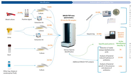 - Vrioni, G.; Tsiamis, C.; Oikonomidis, G.; Theodoridou, K.; Kapsimali, V.; Tsakris, A. MALDI-TOF mass spectrometry technology for detecting biomarkers of antimicrobial resistance: Current achievements and future perspectives. Ann. Transl. Med. 2018, 6, 240. [Google Scholar] [CrossRef] [PubMed]