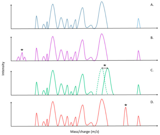Schematic representation of possible MALDI-TOF MS spectra patterns for direct determination and identification of antimicrobial resistance. (A) Sensitive strain. (B) Detection of antimicrobial resistance by the detection of metabolites related to the degradation of the antibiotic. (C) Detection of antimicrobial resistance by the detection of a peak shift, which could be related to a mutation in the biomarker gene that confers antimicrobial resistance (AMR). (D) Detection of antimicrobial resistance by the detection of unique biomarkers, which could be related to the production of a specific molecule (e.g., enzymes, porins). (*) Peak differences in comparison with the sensitive strain spectra (A).