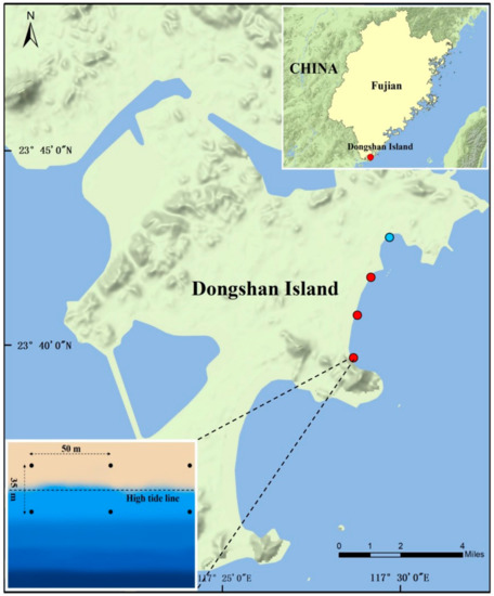 The location of sampling sites in Dongshan Island, Fujian Province, China. Three of four sites (red dots) located in Jinluan Bay, while another one (blue dot) located in Maluan Bay. Triplicate surface sediments (0–10cm) were collected from supratidal or intertidal zones of each site.