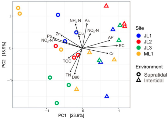 Principal component analysis (PCA) ordination biplot of the environmental factors of the intertidal and supratidal sands. Arrows in black represent environmental variables (D90: sand grain size D90 (μm); EC: electric conductivity; TOC: total organic carbon; TN: total nitrogen; NH4-N: ammonium-nitrogen; NO2-N: nitrite-nitrogen; NO3-N: nitrate-nitrogen; AP: available phosphorus; Cr: chromium; Cu: copper; Zn: zinc and Pb: lead). Sites JL1-JL3 located in Jinluan Bay, while site ML1 located in Maluan Bay of Dongshan Island.