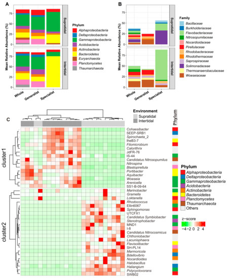 Taxonomic compositions of whole microbial communities as well as habitat generalists-specialists at the (A) phylum/class and (B) family levels. Only nine dominant phyla/classes or abundant families are shown. (C) Heatmap diagram showing the distribution of 39 microbial indicators (genera) in the supratidal and intertidal sands in Dongshan Island, China. Each row and column of the heat map diagram corresponds to a single indicator and sample, respectively. The row data for each indicator was z-score transformed. Dendrograms were constructed based on Spearman correlation clustering. The grey and dark grey colors in the column annotations indicate the supratidal and intertidal samples, respectively. The row annotation on the right-hand side indicates the phylum/class of each indicator.