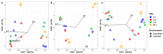 The constrained analysis of principal coordinates (CAP) based on the Bray-Curtis dissimilarity of (A) whole microbial communities, (B) habitat generalists, and (C) specialists from the coastal sandy sediments. Significant environmental factors were identified by using the forward selection procedure (p < 0.05), and then displayed in CAP ordination plots.