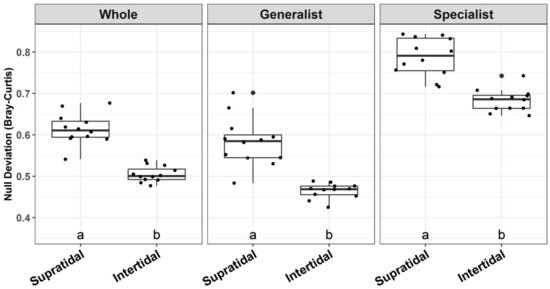 The frequency of the occurrence of microbial ASVs in the intertidal communities (R2 = 0.671) showed a much better fit to the neutral model than that of the supratidal communities (R2 = 0.224) (Figure 7A,B). The estimated migration rates were also higher in the intertidal (m = 0.028) than in the supratidal (m = 0.013) communities. In addition, the ratio of the richness of the non-neutrally distributed (i.e., over- and under-represented) to neutrally distributed ASVs (i.e., the total number of over- and under-represented ASVs/the number of neutrally distributed ASVs) was higher for the habitat specialists (supratidal: 2.49; intertidal: 0.667) than for the habitat generalists (supratidal: 0.142; intertidal: 0.278), in either the intertidal or supratidal zones (Figure 7C). The ratio of the relative abundance of the non-neutrally distributed to neutrally ASVs was also higher for the habitat specialists (5.993) than for the habitat generalists (0.274) in the supratidal zone; however, in the intertidal zone, the ratio of the relative abundance of the non-neutrally distributed to neutrally ASVs was comparable for habitat generalists (0.698) and specialists (0.658) (Figure S3).