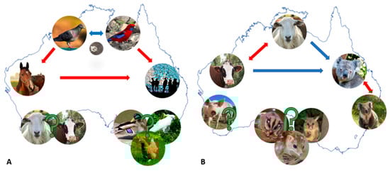 Schematic representation of postulated epidemiology and cross-host transmission of the chlamydial infections in Australia. (A) Postulated cross host transmission of Chlamydia psittaci (Cps) infections and (B) Postulated cross host transmission of Chlamydia pecorum (Cpec) infections. Red arrows indicate the most likely cross-host transmission routes supported by molecular investigations (e.g., in A, Cps from birds or horses to humans and in B, Cpec between koalas or livestock). Blue arrows indicate likely (hypothesised) routes of cross-host transmission (e.g., in A, Cps between birds and in B, livestock Cpec to koalas) and green question marks indicate scarce reports in the denoted hosts and mainly unknown epidemiology.