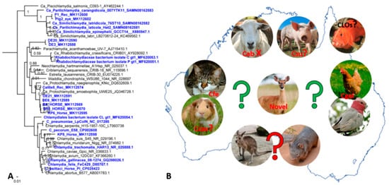 Genetic diversity of chlamydial infections in an expanded host range in Australia. (A) a mid-point rooted maximum likelihood phylogenetic tree constructed using an alignment of the 298bp “chlamydial” signature fragment of the 16S rRNA gene from the publicly available sequences from Genbank. Support values are shown on the major nodes. Phylogenetic positioning of taxa described in Australian hosts are highlighted in bold and blue. (B) Schematic representation of an expanded range of animal hosts for chlamydial infections, where X denotes exotic chlamydial species (e.g., Chlamydia abortus), red question marks indicate no or anecdotal infection or hosts reports (e.g., Chlamydia caviae and Chlamydia suis, wombats and kangaroos), and green and black (for chlamydia-like organisms (CLO) in fish) question marks indicate scarce reports in the denoted hosts and mainly unknown epidemiology.