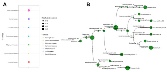 Presence of fungi in Atacama halite metagenome: (A) relative abundance of fungal family in the halite metagenome; and (B) fungal species annotated as endolithobionts in the halite metagenome.