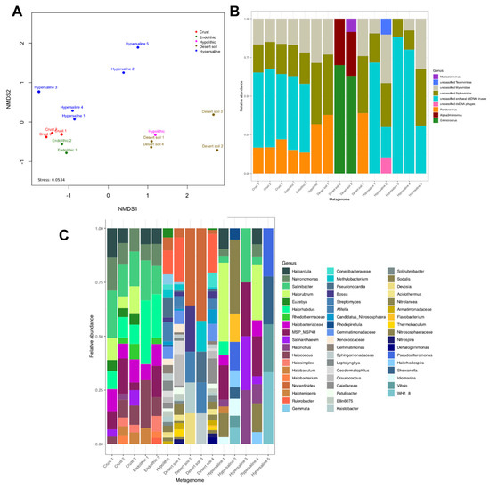 A comparison was conducted using currently available metagenomic data, e.g., the metagenomic sequences from halite-derived communities obtained in [8,9]. Additionally, metagenomics data obtained from desert soils, hypersaline environments (salterns) and hypolithic microbial communities from the Namib Desert were also used (Table S1). All these metagenomes were processed with the same pipeline that was used for our metagenomics sample and compared to evaluate their taxonomic similarity. The comparison was performed in R using Vegan library via a multidimensional scaling procedure considering taxonomic domains. Moreover, a biogeochemical cycle analysis was performed through identification of the completeness of metabolic pathways involved in carbon, methane, nitrogen, and sulfur cycling, using Multigenomic Entropy Based Score (MEBS) software [68].