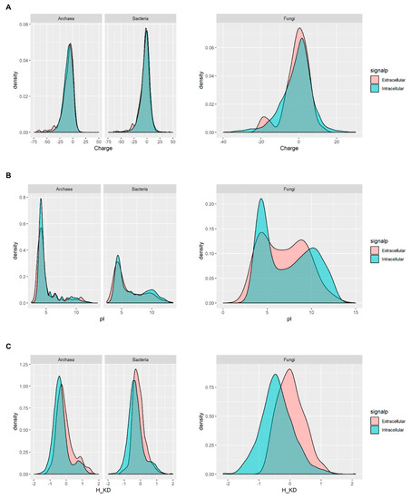 Biophysical properties of the predicted intracellular proteome and predicted secretome (by SignalP v4.0) in the metagenomic sequences from Atacama Desert halites. (A) Charge; (B) pI; and (C) Kyte-Doolittle Hydrophobicity (H_KD) index are represented for Archaea and Bacteria (left) and Fungi (right).