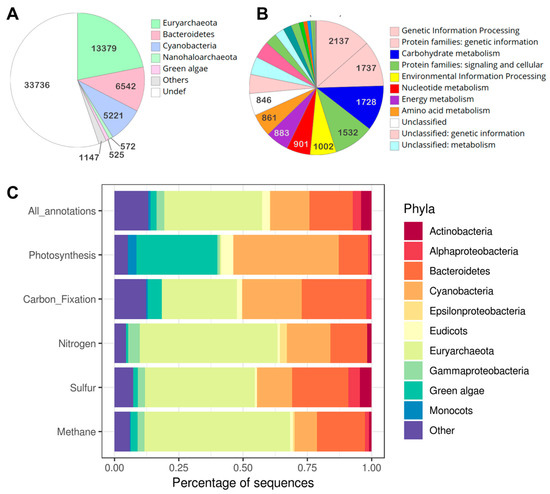 Functional description of the endolithic community in halites: (A) open reading frames predicted in different phyla; (B) main functional processes enriched in the halite metagenome; and (C) the Kyoto Encyclopedia of Genes and Genomes functional annotation.