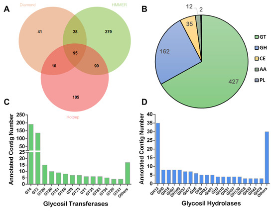 - Zhang, H.; Yohe, T.; Huang, L.; Entwistle, S.; Wu, P.; Yang, Z.; Busk, P.K.; Xu, Y.; Yin, Y. Dbcan2: A Meta Server For Automated Carbohydrate-Active Enzyme Annotation. Nucleic Acids Res. 2018, 46, 95–101. [Google Scholar] [CrossRef] [PubMed]