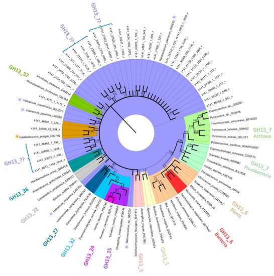 These findings suggest that Atacama halites could be a novel source of halophilic GH13 α-amylases, but further in silico and detailed biochemical characterization would be required to formally proposed these as new GH13 subfamilies. However, a few of these α-amylases are distantly clustered with the GH13-7 subfamily, which have been described as potential α-amylases.