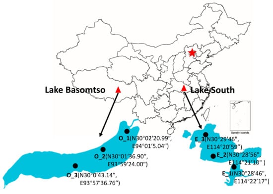 The study was conducted in oligotrophic Lake Basomtso and eutrophic Lake South. Lake Basomtso (area of 27 km2, maximum depth of 120 m, and mean depth of 68 m) is one of the largest dammed freshwater lakes in the southeast of Tibet. Lake South (area of 5.50 km2, maximum depth of 3.2 m, and mean depth of 1.6 m) is located in Wuhan City in the Middle-Lower Yangtze plains. From both lakes, samples were collected in August 2018. At oligotrophic Lake Basomtso, samples were collected from the surface (O-S1, O-S2, O-S3) and bottom water layers (O-B1, O-B2), as well as from the sediments (O-SE1, O-SE2, O-SE3) from three sites situated from the river inlet to the lake center. At eutrophic Lake South, samples were collected from the surface water layers (E-S1, E-S2, E-S3) and from the sediments (E-SE1, E-SE2) from three sites situated from the shore to the center. The locations of the studied lakes and sampling sites are presented in Figure 1.
